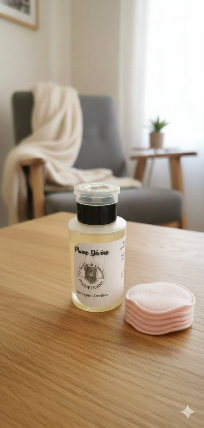 Découvrez Plume Divine, notre nettoyant oreille chien naturel artisanal conçu pour purifier et apaiser les oreilles sensibles de votre compagnon