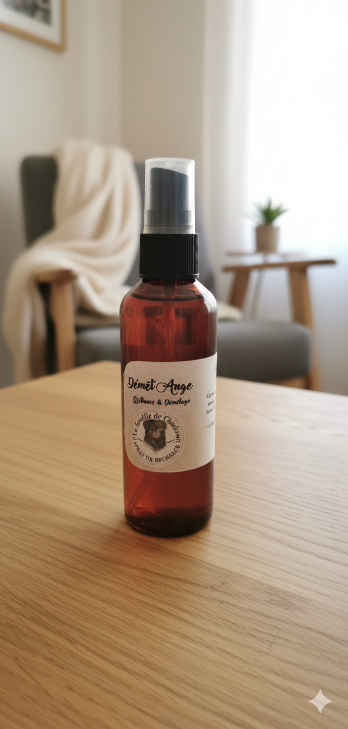 Chaque spray Démêl’Ange est fabriqué à la main dans mon atelier, en petite série, avec des ingrédients naturels et une formulation douce, pensée pour le bien-être des chiens.